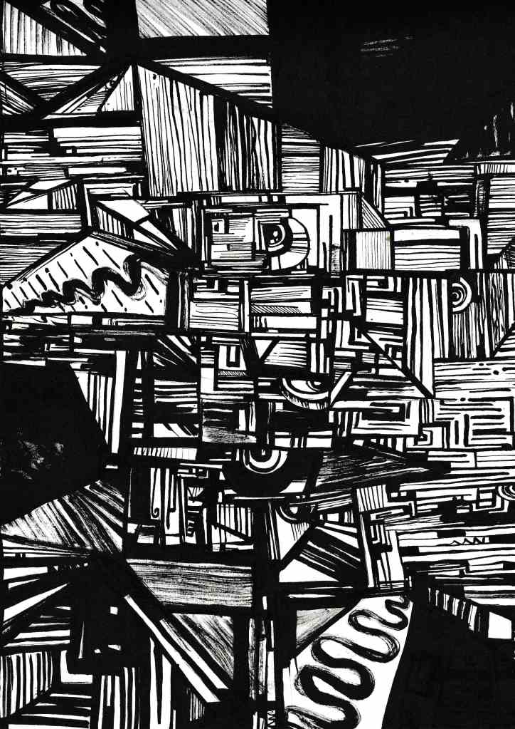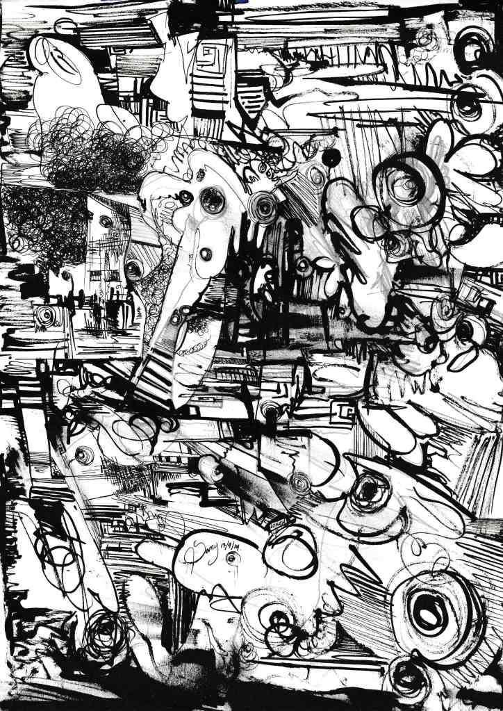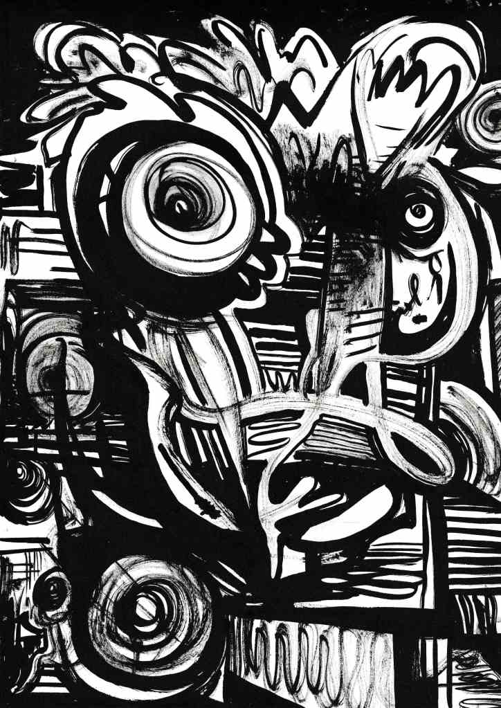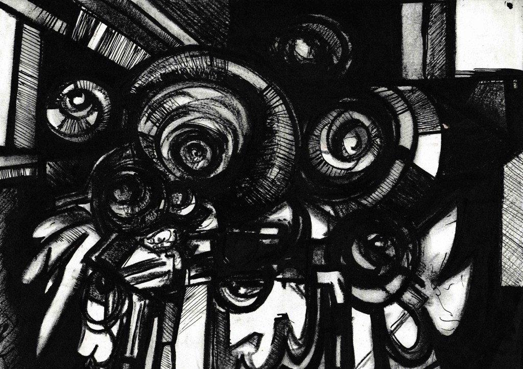 En los inicios sentimos la búsqueda de formas, líneas, experimentos con los materiales de tinta, lápiz y carboncillo, creando expresiones inigualables que transmiten miedo, monstruos, búsqueda interior, espontaneidad, libertad y experiencias pasadas, vivencias.